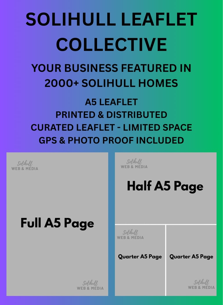 Put your business in 2,000+ local Solihull homes with a professionally produced shared A5 leaflet, delivered door-to-door to selected neighborhoods.